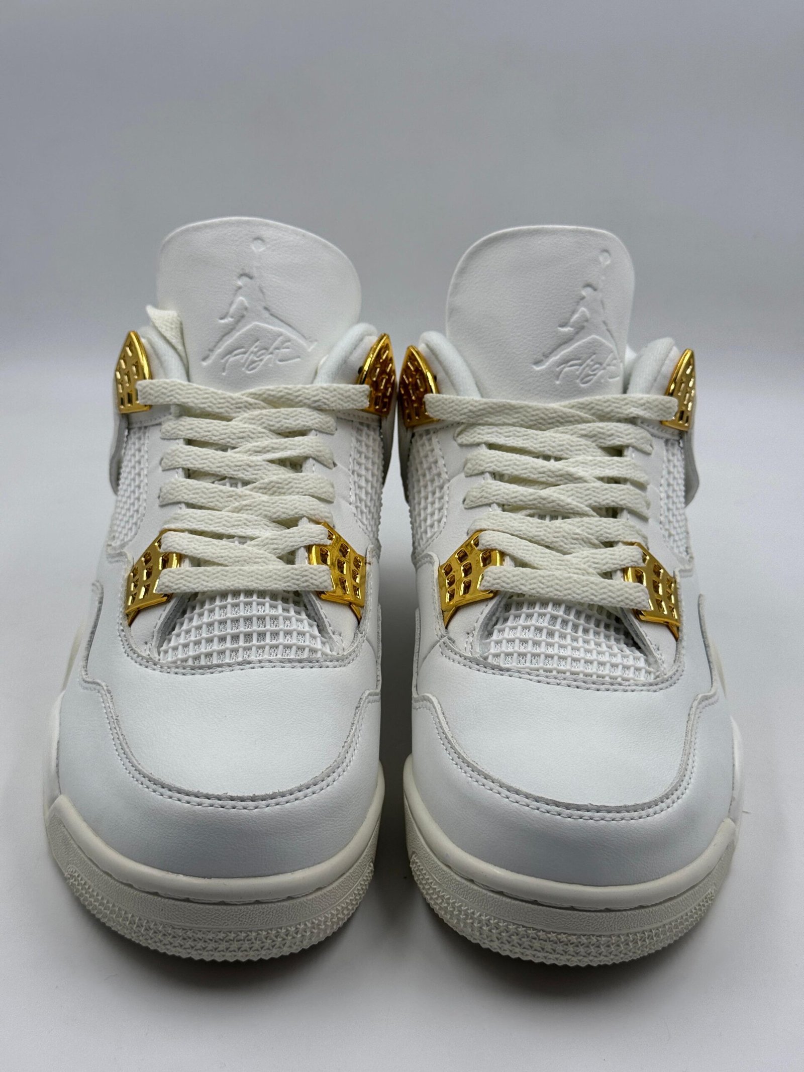 The Air Jordan 4 Retro Metallic Gold combines classic style with modern flair. Featuring a crisp white leather upper, this iconic sneaker is highlighted by metallic gold accents on the eyelets, branding, and heel. The sleek design is complemented by a durable midsole and responsive Air cushioning for all-day comfort. With its luxurious details and timeless silhouette, this pair is a must-have for sneaker enthusiasts and collectors alike.