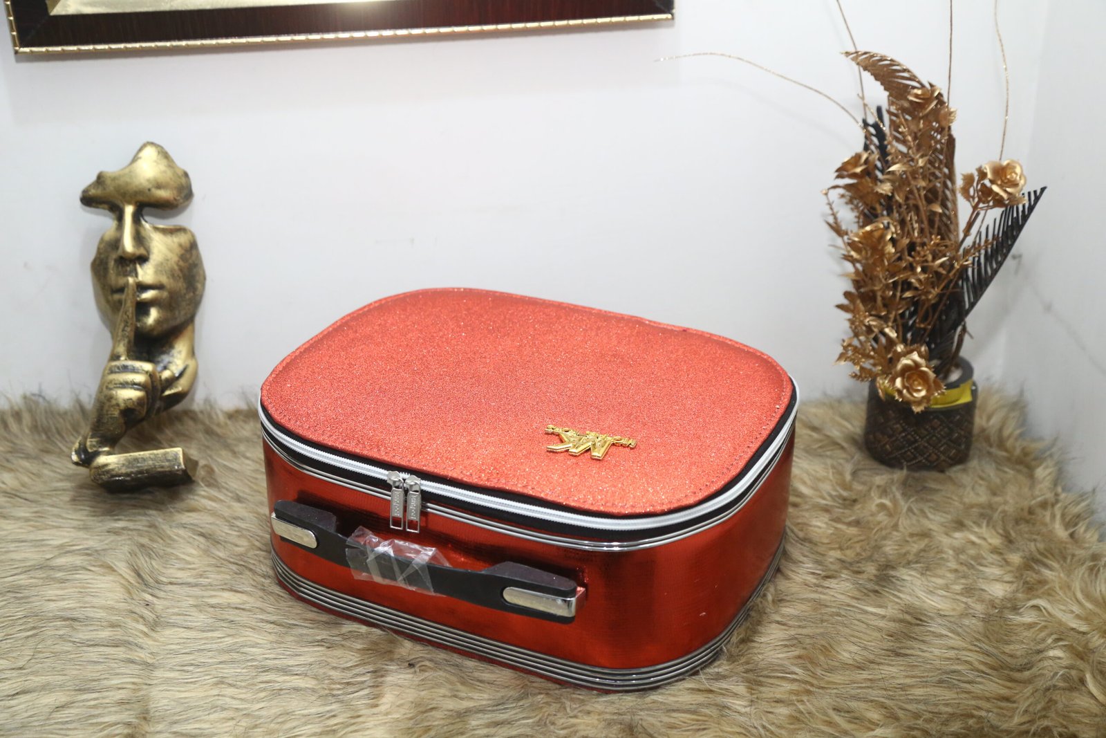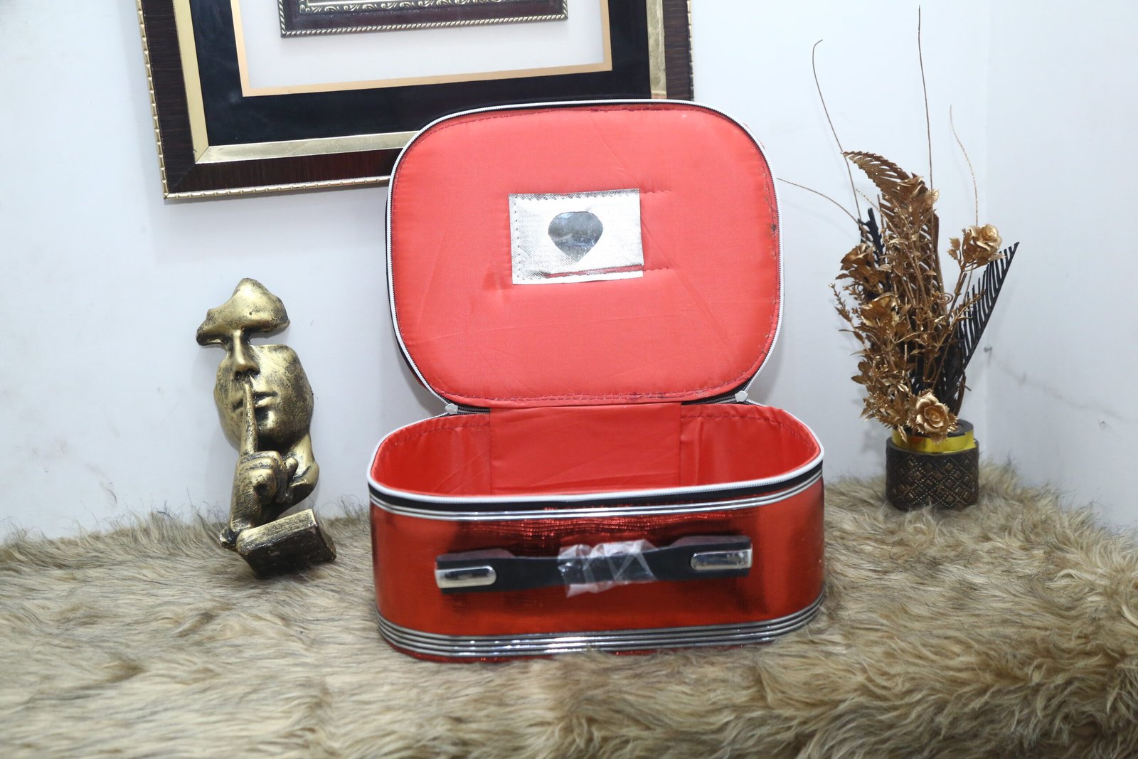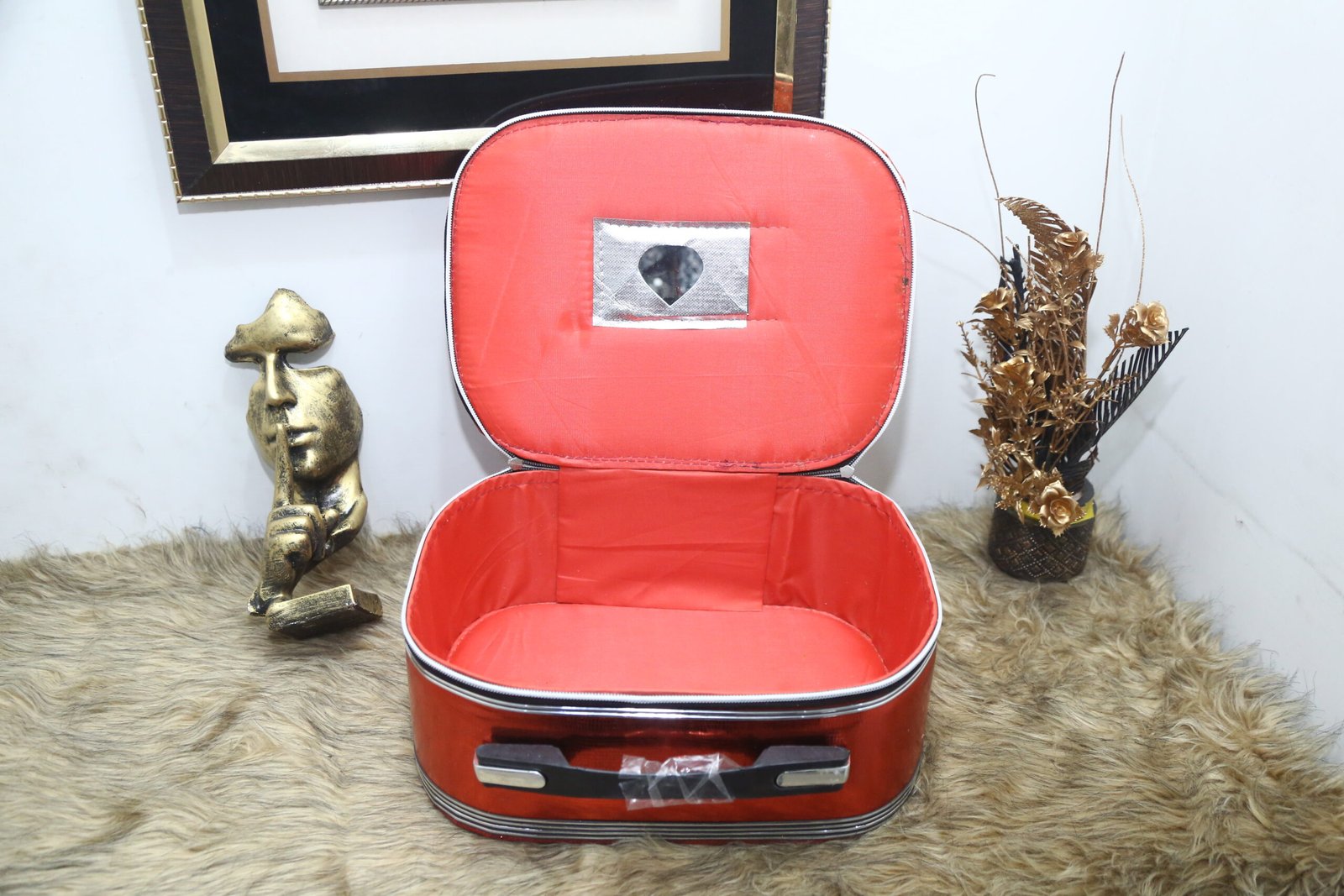 Travel and store your cosmetics in this vibrant Red Glitter Vanity Case. The exterior features a bold, shimmering red finish with a durable silver trim and a black carrying handle. When opened, it reveals a spacious interior lined with a matching bright red fabric and a small heart-shaped mirror inset into the lid, offering practical storage for essential makeup and toiletries.